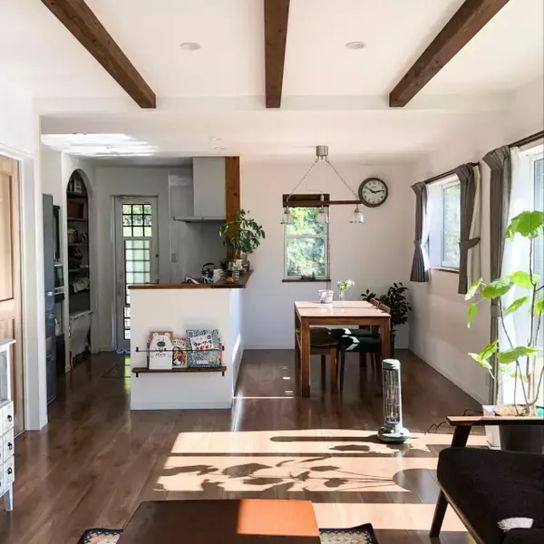 落ち着きとぬくもりを感じさせるNoooAさん宅のリビングダイニング。カウンターキッチンのサイドに、お子さんの絵本を収納されています。絵本の表紙が空間のアクセントにもなって、カフェにいるかのようなインテリアになりました。