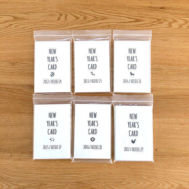 ジップ付きの透明袋に年ごとに分けて保管しているusaco.さん。身近なアイテムを使っているのですぐにでもマネできるアイデアです。ラベルとして西暦と和暦を入れているのも、分かりやすくていいですね。シンプルでキュートに統一されたラベルデザインも素敵です。
