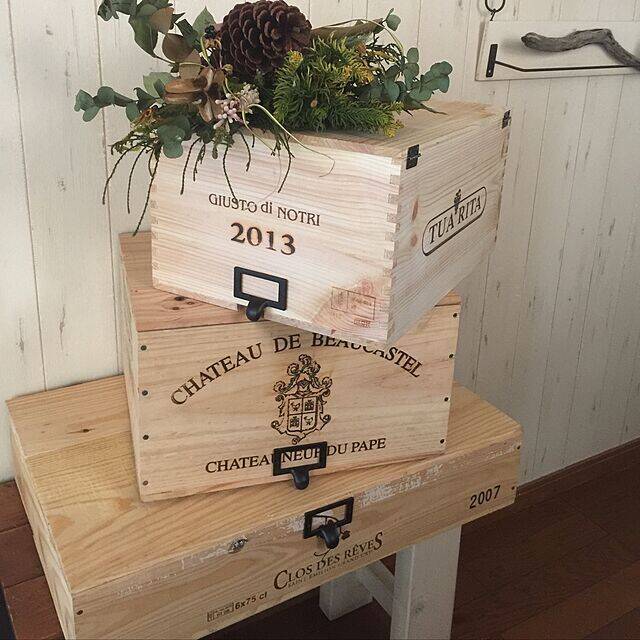 ナチュラルな木目と、スタイリッシュな焼印がオシャレなフタ付きワイン木箱。RURULOVEさんは、酒屋さんで購入されたワイン箱を、取っ手と蝶番で収納BOXにリメイクされています。キッチンの食器棚上とお酒コーナーの下に置かれるそうですよ♡