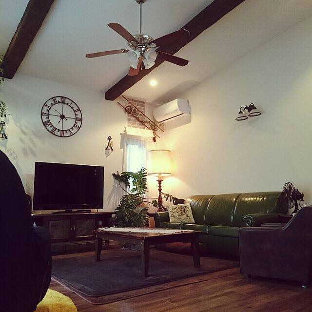 高い天井にファン付きの照明や大きな梁が印象的なリビングです。グリーンのソファーや黄色のラグがアクセントカラーになっており、それらがより南欧風にしてくれます。また、時計や扇風機などレトロ感のあるものも置かれ、ヨーロッパホテル風のリゾート感ですね。