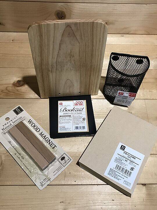 ブックスタンド(180mm×125mm )200円商品【ダイソー 売場:オフィス/文具】ペン立て(95mm×75mm×60mm )【ダイソー 売場:オフィス/文具】メモパッド(140mm×100mm )【ダイソー 売場:オフィス/文具】マグネットバー(100mm×10mm )【ダイソー 売場:オフィス/文具】■必要な道具