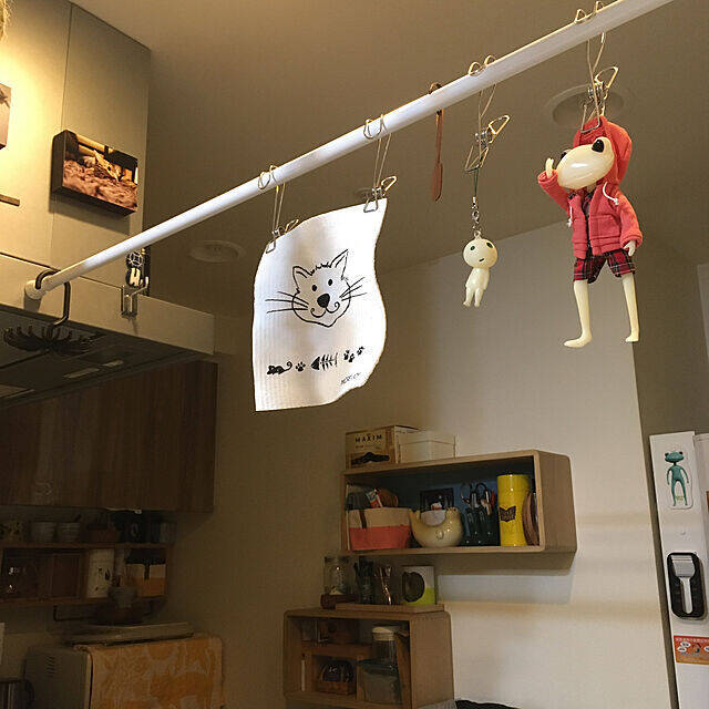 シンクの上に突っ張り棒を渡し、ちょっとしたものの干し場を作っている実例です。布巾類もスッキリ乾かせそうですね。普段は牛乳パックや手ぬぐいなども干しているそうです。実例のようにキュートなスポンジワイプや雑貨を干せば、心の和む空間になります。
