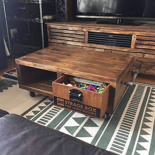DIYしたテーブルに、大きめの引き出しを設置したユーザーさん。リビングで遊ぶことの多いお子さんがすぐに片付けられるように、LEGOの収納ボックスとして活用されているそうですよ。引き出しにつけられたステッカーも含め、男前なインテリアにぴったりな仕上がりとなっていますね。