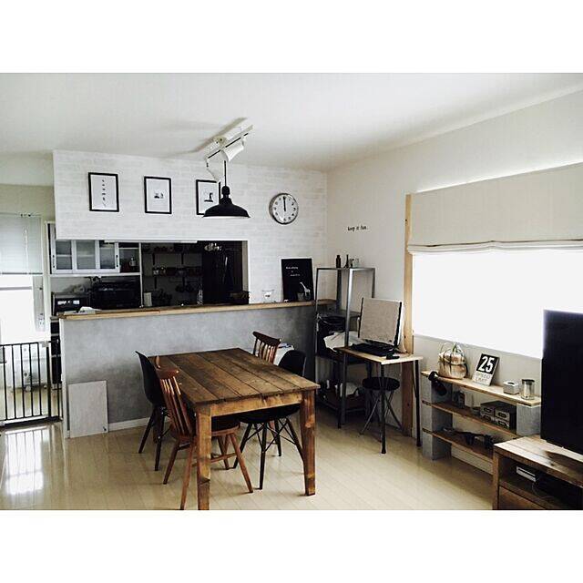 キッチンカウンターの下にコンクリート風の壁紙を貼ったというユーザーさん。ブラックが効果的に取り入れられている塩系のインテリアに、コンクリートのグレーカラーが、味のある雰囲気をプラスしていますね。古材風のテーブルとの相性も抜群です。