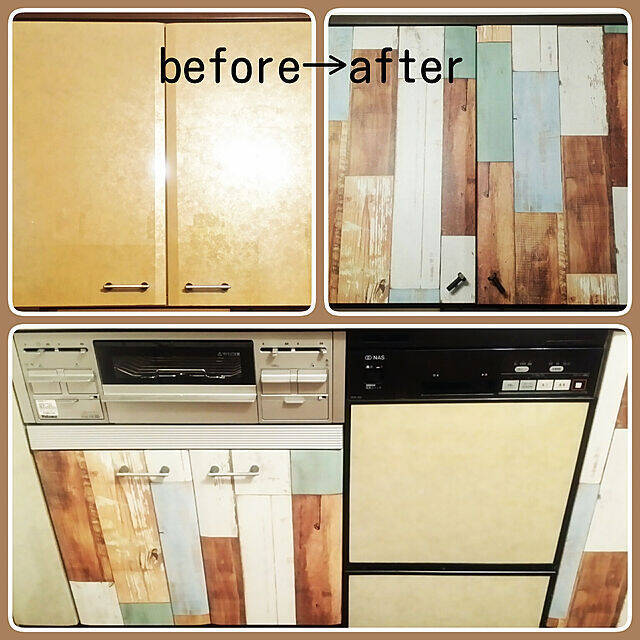 RUIさんはmt CASAの家具用マスキングテープで、キッチンの扉をリメイクされています。幅広なので広い面にも貼りやすいようです。オーソドックスな無地の扉が、ヴィンテージ感のあるペイントウッド柄になり、キッチンの雰囲気がグンとアップしています。
