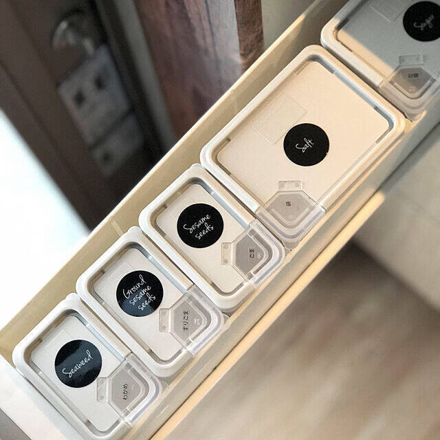 hamuさんはケースを統一して、調味料をコンロ横の引き出しに収納。四角いケースがぴったり納まっていて、スッキリと気持ちがいいですね。モノトーンのラベルもスタイリッシュ。引き出しの中まで、こだわりのコーディネートになっています。