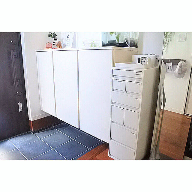 こちらのユーザーさんは、無印良品のポリプロピレンケースをお使いです。玄関先で身支度が完成するよう、アクセサリーやハンカチ、エコバッグなどの小物を収納されています。メダカの飼育セットは、飼育係のお子さんが手の届きやすい位置にと、収納箇所も工夫されていますよ。ラベル付きで家族みんなが使いやすそうです。