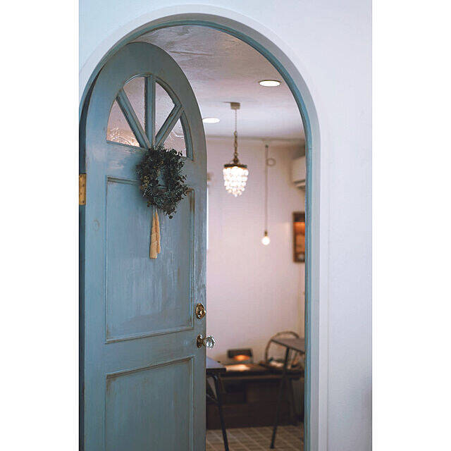 アンティークな風合いのドアを用いて、記憶に刻まれるワンシーンを作り上げているmilleさん。シャビーシックなペールブルーの色彩が、クラシカルなドアのデザインをより引き立てています。こだわりが感じられるキーホールやドアノブ、そしてその向こうに垣間見える風景など、すべてが美しい調和を描いています。