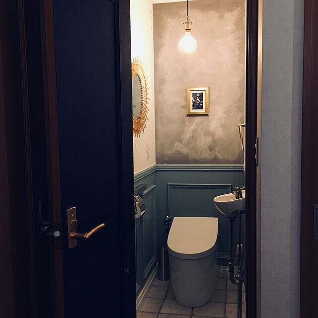 家の中で最も生活感を感じる場所はトイレかもしれません。FumiyoshijmiさんはDIYでそんなエリアを美しい空間へと作り上げています。腰壁はシックなブルーグレーをペイントし、壁は風合いのある漆喰に。鏡やシンク、トイレットペーパーホルダーなど、きめ細やかなこだわりが感じられるスペースです。