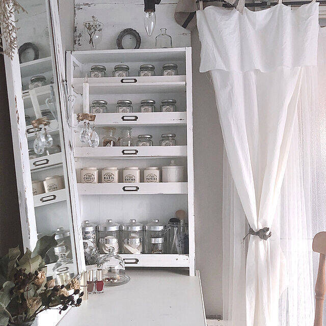シャビーシックな収納のお手本にしたいのが、優し気なホワイトカラーで作り上げたtarさんのメイクスペースです。使用頻度の高いものは引き出しに、普段使わないものは小瓶に入れて美しく見せる収納にされています。余白のあるゆとりある空間に小瓶が映えて、いつまでも眺めていたいスペースとなっています。