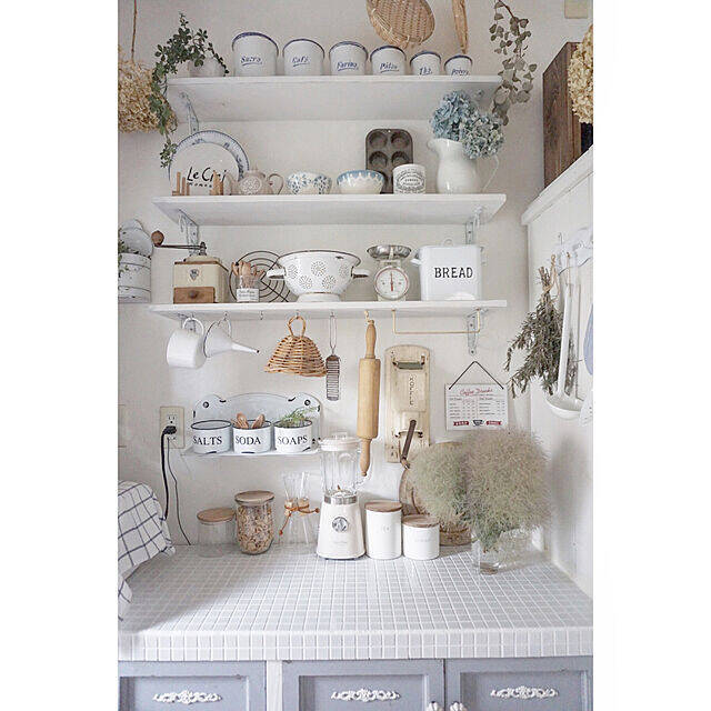 味わい深い表情を持つキッチンツールがより輝く収納をされているkoharuさん。ナチュラルなホワイトカラーに淡いブルーがプラスされ、見ているだけで心が癒されていくコーナーとなっています。アイテムをつめ込み過ぎずバランス良く配置しており、雑貨やツールの収納に悩んでいる方は必見のコーディネートです。