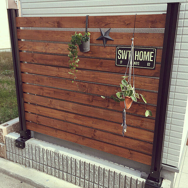 こちらのユーザーさんは、玄関口の空間にフェンスを作っています。横の黒い柱に、味のあるブラウンのペイントがぴったりで、かっこいい仕上がりになっています。グリーンをハンギングディスプレイできるようになっていて、活躍の幅も広そうです。