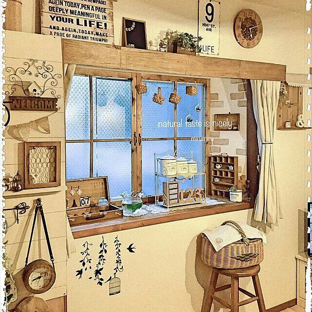 リビングの窓まわりのインテリアです。カーテンレールの上には、ニトリの木目の時計が掛けられています。白と木目に統一されたカントリースタイルのインテリアの中で、非常にマッチしていますね。小ぶりな掛け時計ですが、天井とカーテンレールの間のスペースにはちょうどいい大きさです。