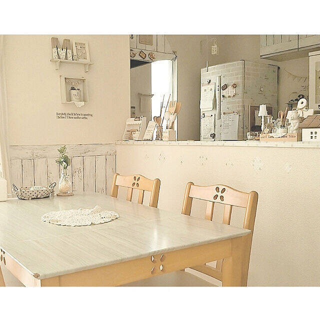 ホワイトナチュラルなインテリアを楽しんでいるririhoさんの、キッチンダイニングです。白の木目調を取り入れて、さわやかでナチュラルな雰囲気がとても魅力的ですね。お部屋に散りばめられた雑貨たちも、かわいらしく、心がキュンとしてしまいそうです。