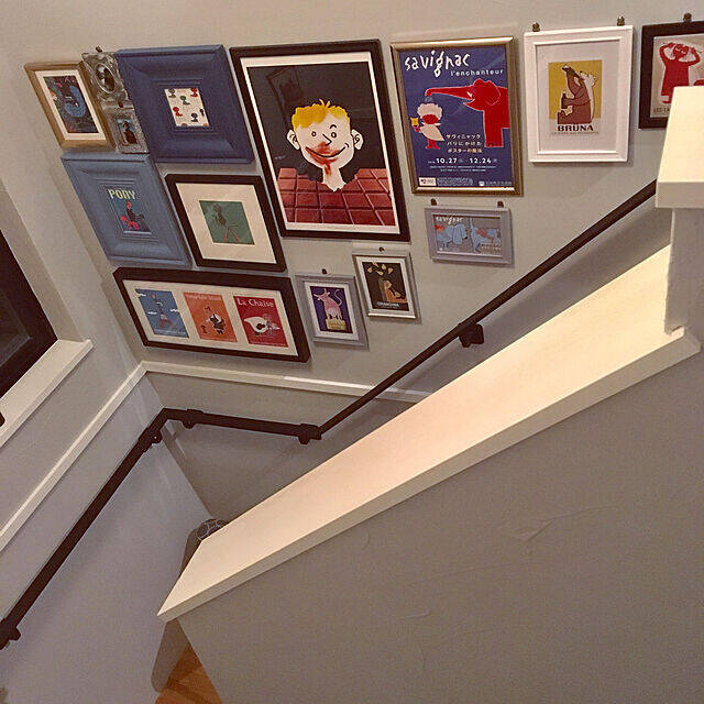 mashleyさんはサヴィニャック展で購入された、ポスターやポストカードを階段横の壁に飾られています。壁の見切りや手すりのラインに合わせることで、大きさがバラバラなフレームを収まりよく見せています。階段を通るたび、お気に入りのアートを眺められるのは幸せでしょうね。