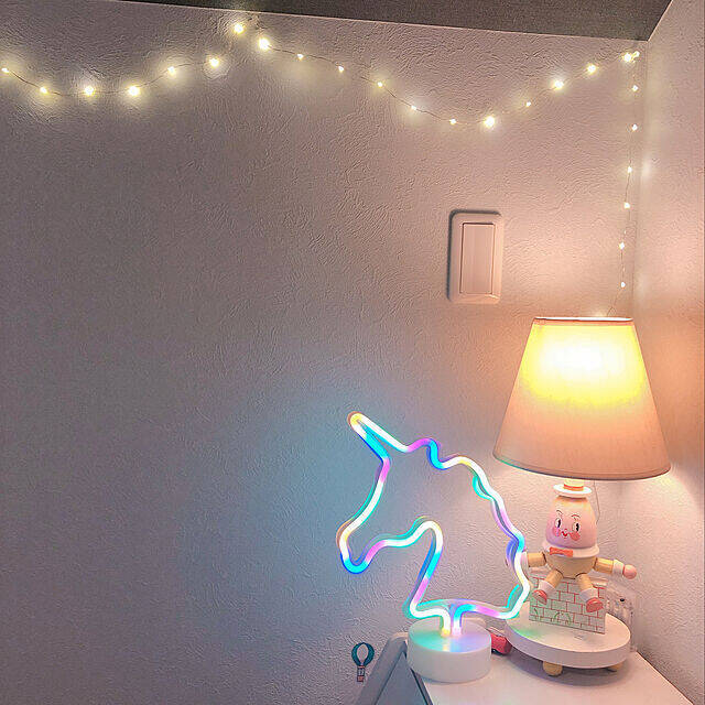 ユニコーンといえば、ゆめかわいいの象徴的なモチーフですよね。harukaoruさんのお部屋の、ユニコーン型のネオンサインは、淡いレインボーカラーに光り、置いておくだけでもゆめかわいい気分が味わえそう♡他のライトの光と合わさり、さらに幻想的で、夢の世界へ連れて行ってくれそうです。
