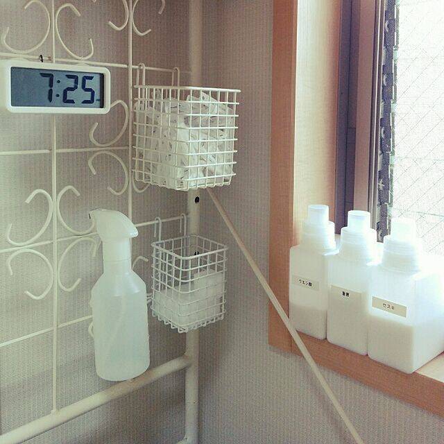 洗濯機周辺に洗濯グッズをひとまとめにして収納していました。上部にある収納棚にセリアのキッチンワイヤーフリーバーを取り付けて、空いた空間をうまく利用しています。洗濯ばさみもひも付きの小物入れを活用することで、ここに掛けて一緒に収納できる工夫をしていました。