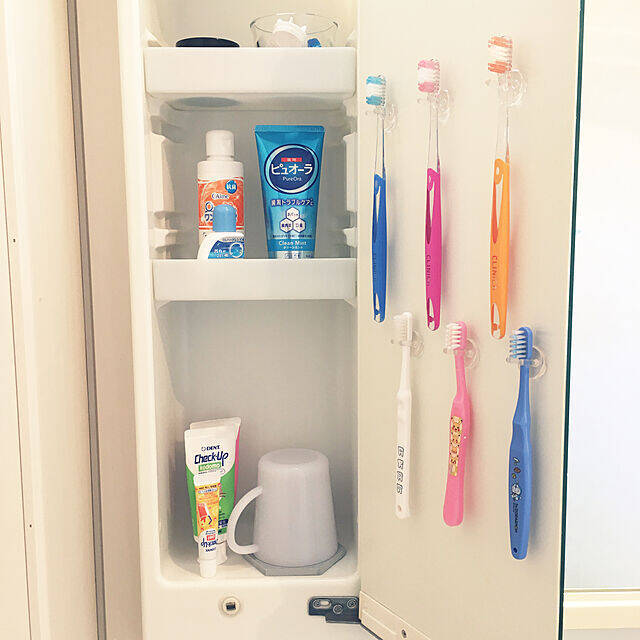 823smileさんが歯ブラシを収納しているのは、貼ってはがせるタイプのフィルムフック歯ブラシホルダー。棚の扉裏に貼っているので、とても省スペース。少しずらして取り付けて、上段の歯ブラシの水滴が下段に落ちない工夫をされています。