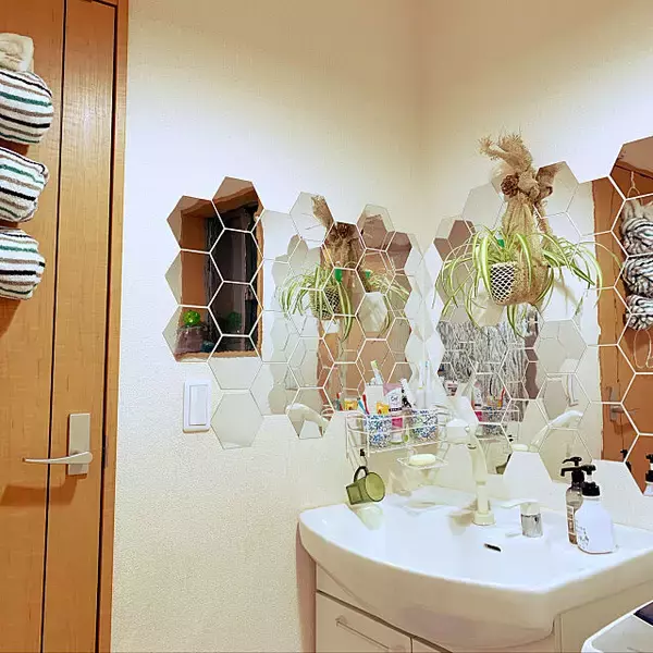 satoさんのお宅の洗面スペースには、ニトリの六角形のミラーシールがたくさん貼られていて、アーティスティックな雰囲気です。鏡としての機能はもちろん、ウォールステッカーのようにお部屋のアクセントにもなりますね。簡単に貼れて貼りなおせるので、配置を考えながら楽しく貼れそうです。