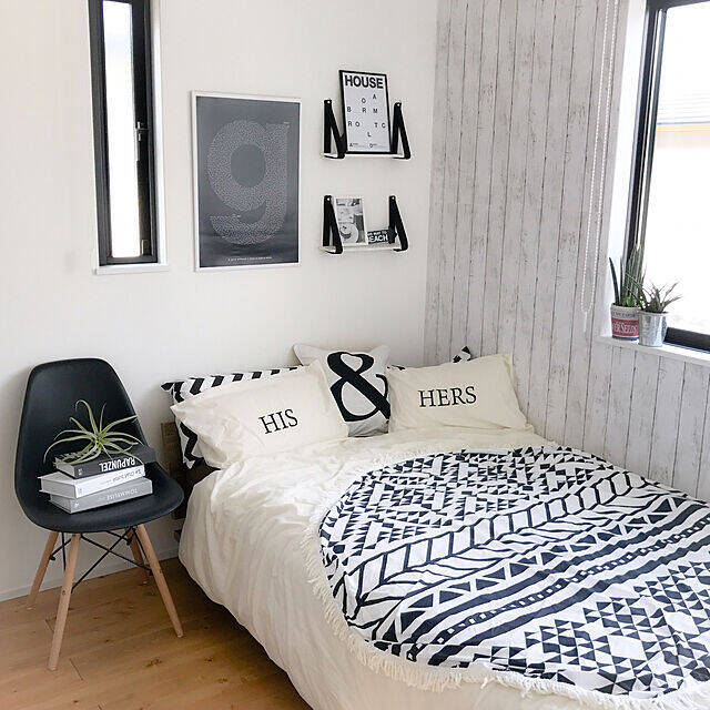 こちらは、ダイソーのモノトーンの布団カバーです。600円商品ですが、布団カバーまでもプチプラで手に入るのはうれしいですね!HIROKOさんはまくらカバーも同じ柄でそろえられていて、すっきりとスタイリッシュな印象で、お部屋全体も明るい雰囲気になりそうです。