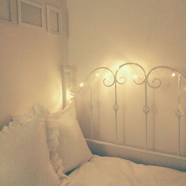 イルミネーションライトをベッドフレームに飾ると、ロマンティックな雰囲気に♡aoさんのベッドフレームには、セリアのLEDライトが付けられていて、幻想的な光を見ながら心地よい眠りに誘われそうです。真っ白なベッドが、光をより美しく魅せてくれていますね。