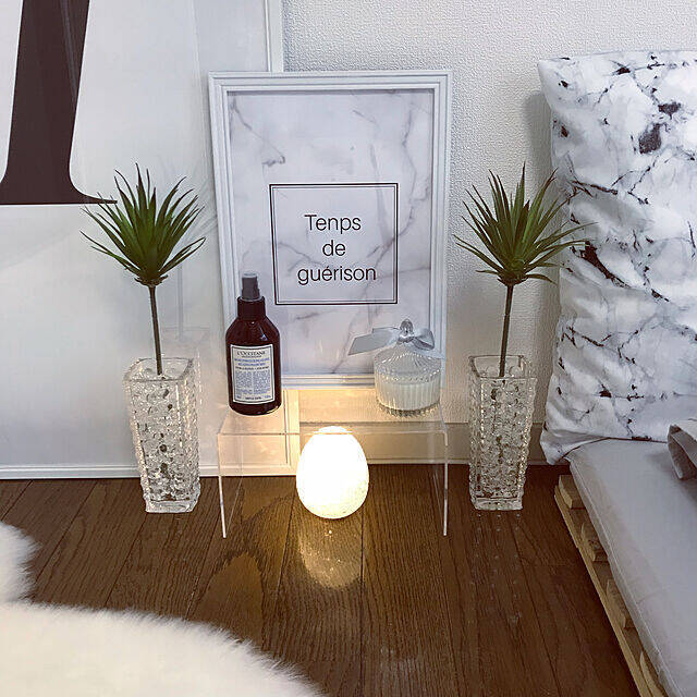 こちらのベッド横のセンス抜群のディスプレイコーナーのライトと、ガラスのビンと緑もダイソーのものだそう。プチプラとは思えない、ラグジュアリーな空間になっていますね。siyonさんのように100均アイテムを取り入れながら、洗練された空間を作り上げることも可能ですよ。