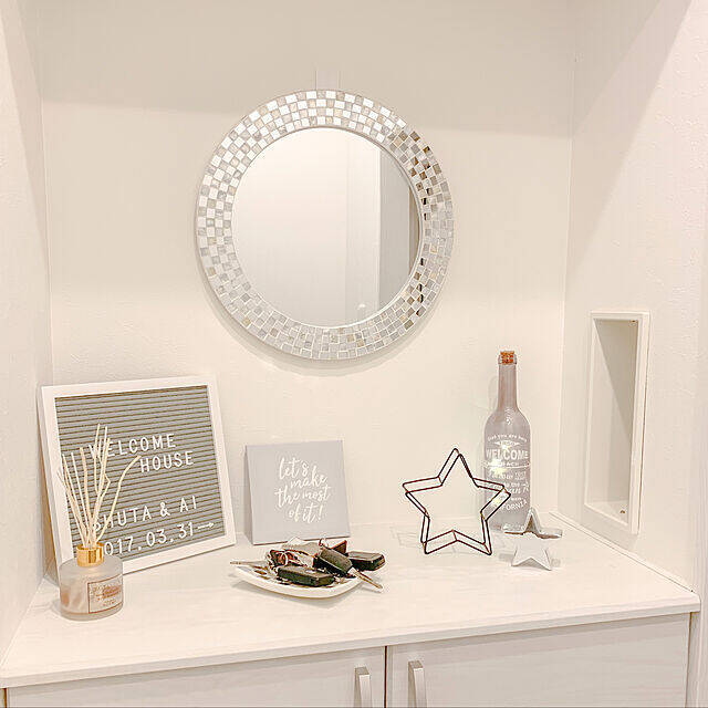 白とグレーが好きなユーザーさんの玄関のディスプレイは、キラキラの丸い鏡やシルバーの星が飾られ、まるで冬に見る夜空のようなディスプレイですね。壁も下駄箱も真っ白で、雪景色のよう。急な来客時のために、玄関に香りのするものを置いておくのもおすすめですよ。
