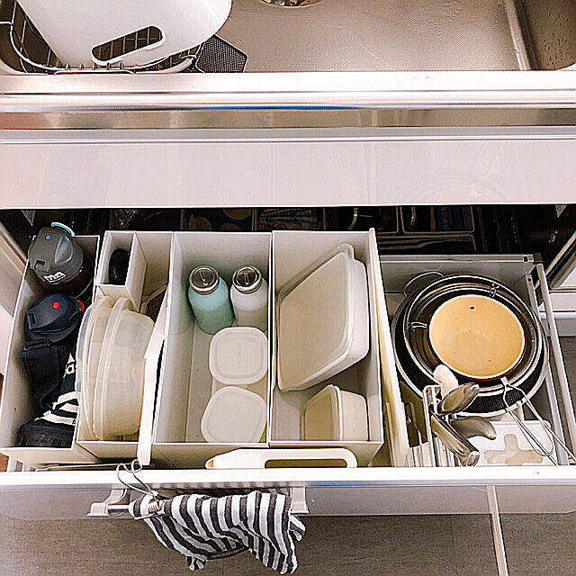 hiromin-626さんは、食器棚の引き出し内でファイルボックスを使用。コーヒーなどのカフェグッズを整頓するため、ファイルボックスの中にシート仕切りボックスを入れて、さらに細かく仕分けられるように工夫しています。種類ごとに場所が決められているので、分かりやすい収納になっていますね。