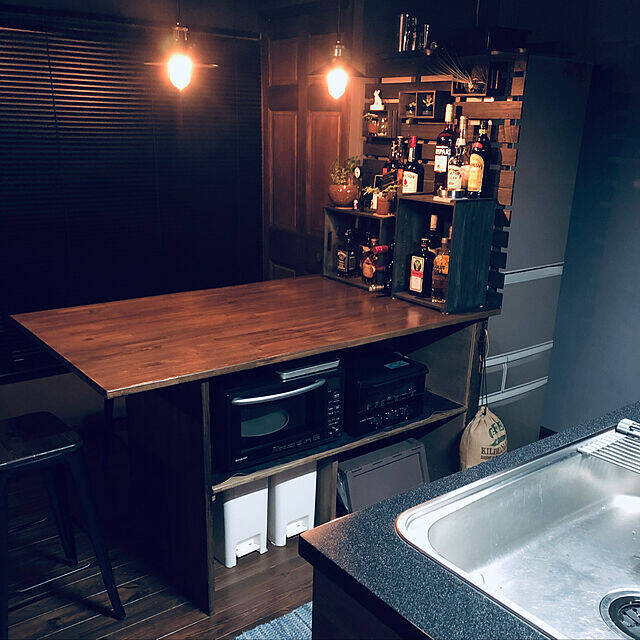 ご自身で作成されたカウンターの下にDIYで棚を設置し、炊飯器を収納されているTakuyaさん。棚を交互に組み合わせるなど、空いているスペースを余すところなく有効活用しており、収納力もたっぷりの棚が完成しています。ヴィンテージ感あふれるクールな雰囲気で、家で過ごす時間が待ち遠しくなるコーナーです。