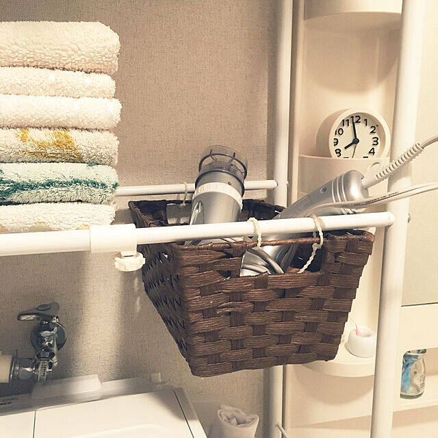 maiikiさんはランドリーラックにカゴを取り付け、ドライヤーを収納されています。カゴの持ち手部分が、結束バンドを通すのに役立っていますね。ラックの棚がないスペースを有効活用しているのも、よいアイデアです。