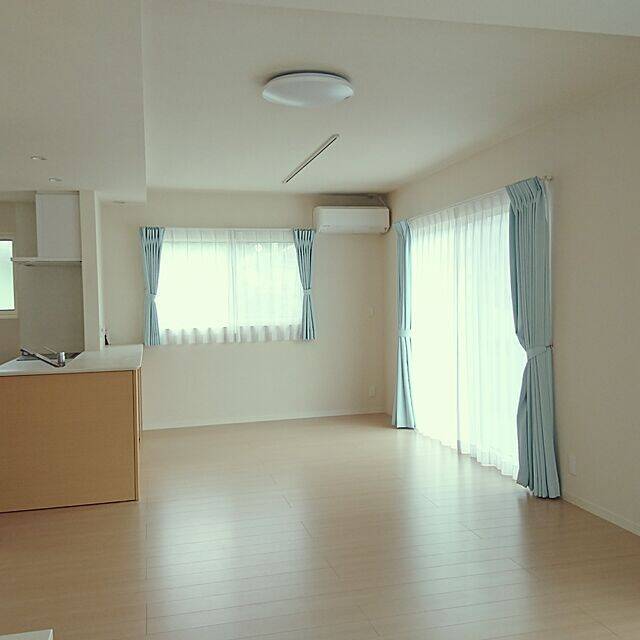 お部屋が決まったら、まず選びたいのがカーテンです。オーダーカーテンの場合だと、仕上がりまで日数がかかることもあるので、高さや幅、必要枚数を確認して前もって準備しておきましょう。na.so2.naさんは水色のカーテンを選ばれていて、明るくさわやかな印象のリビングになっています。