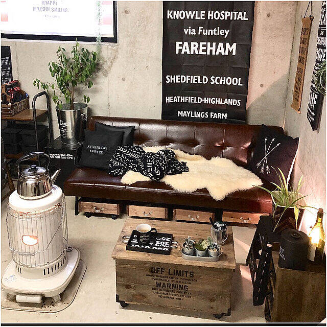 キレのある男前な家具にウッド素材を合わせ、カッコ良くコーディネートされたガレージ。nonさんは、ソファー下の隙間収納とリンゴ箱をリメイクされたテーブルに、キャスターを取り付けています。DIY用の材料や工具、重いものもサッと取り出せます。