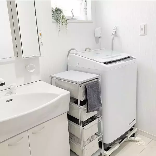 清潔感のあるmiyuさんの洗面所です。ホワイトで統一すると空間が広く見えますね。ホワイトのランドリーラックを設置し、収納スペースを増やしています。サイドにカゴや、タオルを掛けるなど、ちょっとしたスペースも見逃さず、無駄のないよう使いこなしています。