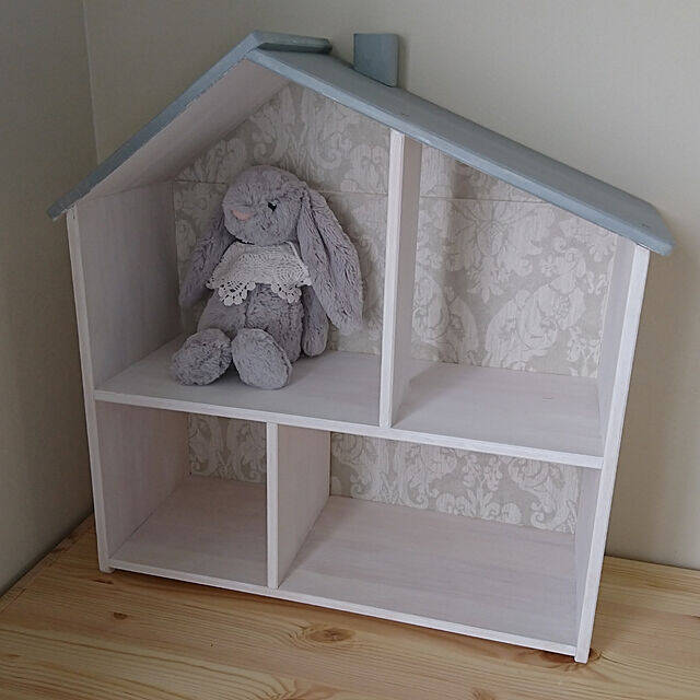 続いてご紹介するのは、市販の棚をベースにしたDIYドールハウスです。もともとは棚なのでたっぷりものが入れられるのも魅力的。おうちに使っていない棚があるという方も参考にしてみてください。