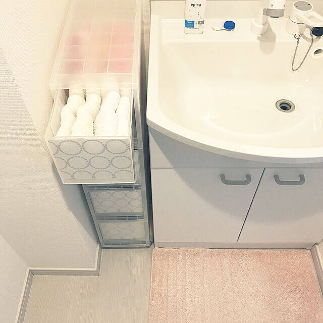 mariさんのタオル収納は、洗面台の横です。使われているアイテムは、重ね使いできる無印良品のポリプロピレンケース。デットスペースに見事にジャストサイズで収まり、半透明のケースには北欧柄で目隠しされています。タオルは取り出しやすく、縦収納でGOOD!