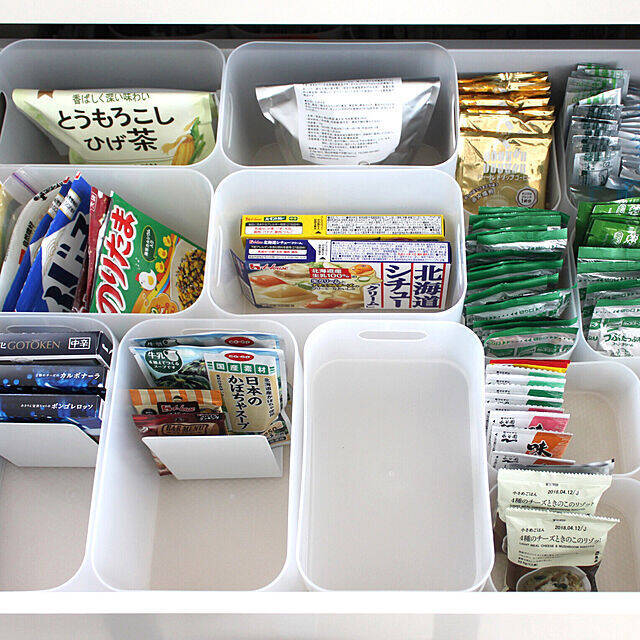 ダイソーの積み重ねできるボックスを使って、食材をきれいに収納されているユーザーさん。積み重ねボックスはサイズ展開も豊富なので、引き出し内を有効活用できます。カテゴリー別でわけられているそうでぱっと見で分かりやすく、すぐ取り出せますね。