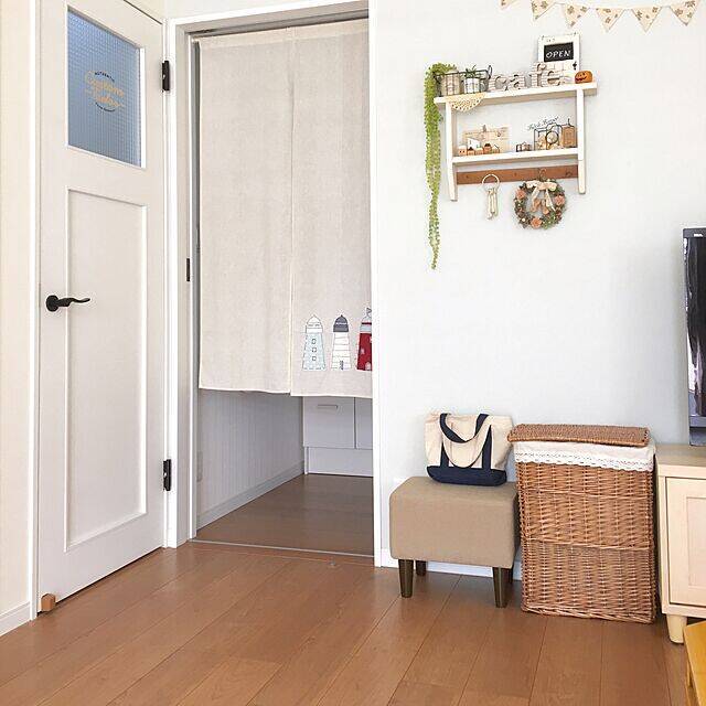 スツールを、わんちゃんのトイレグッズやゴミ箱の収納に活用されているユーザーさん。棚を置くよりも、軽やかな印象になり、すっきりと爽やかにまとまっていますね。ホワイトと天然素材を組み合わせ、見た目にも清潔感が感じられるコーナー作り、参考になります。