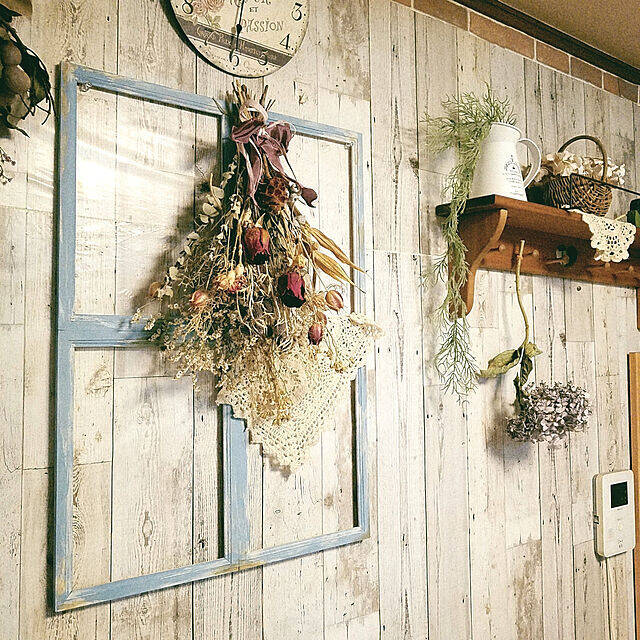 Chiさん宅のウォールディスプレイは、大好きなドライフラワーがメイン。ハンドメイドのスワッグとフォトフレームをDIYした窓枠のコラボが、ガーリー&シャビーです♡オールドウッド風のリメイクシートを貼った壁が、よりアイテムを際立たせています。