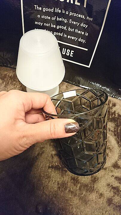 Lecielさんは、日頃からDIYやプチリフォームの材料集めに、100円ショップを利用されています。今回のアイデアも、当時新商品だったLEDライトを見つけて、テレビ横にシンメトリーに飾ってみようと思い立ったのがきっかけで生まれたのだそうです。ただ、いざ置いてみると、特有の白っぽい光がインテリアに合わない!そんなとき、キッチン用品売り場で見つけたのが、このアクリルコップでした。光を反射するカットと、シックな色合い、何よりサイズが、ランプシェードにうってつけですね。