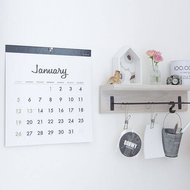 ユーザーさんにも人気のある、スクエア型のカレンダーです。Shooowkoさんは、白を基調としたコーナーにかざりました。日曜日や祝日は、はっきりした赤色で書かれることも多いですが、こちらはくすんだ色合いでプリントされているので、モノトーンのインテリアにもなじみやすくなっています。
