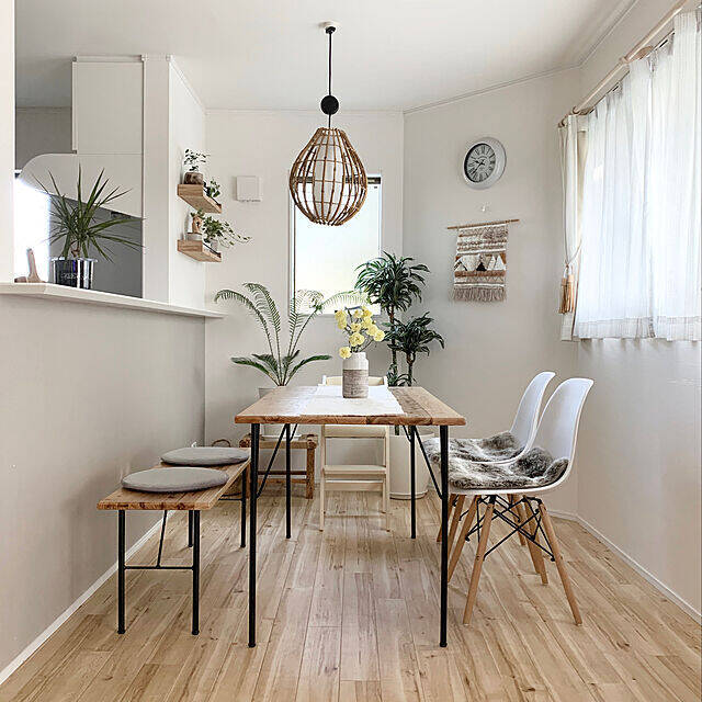 床やテーブルの木の風合いがナチュラルなダイニングルームです。ユーザーさんは、グリーンやお花などの植物をたくさん飾りリゾート感を演出。バンブーでできたペンダントライトとも相まって、より一層癒しの海外インテリアになっていますね。