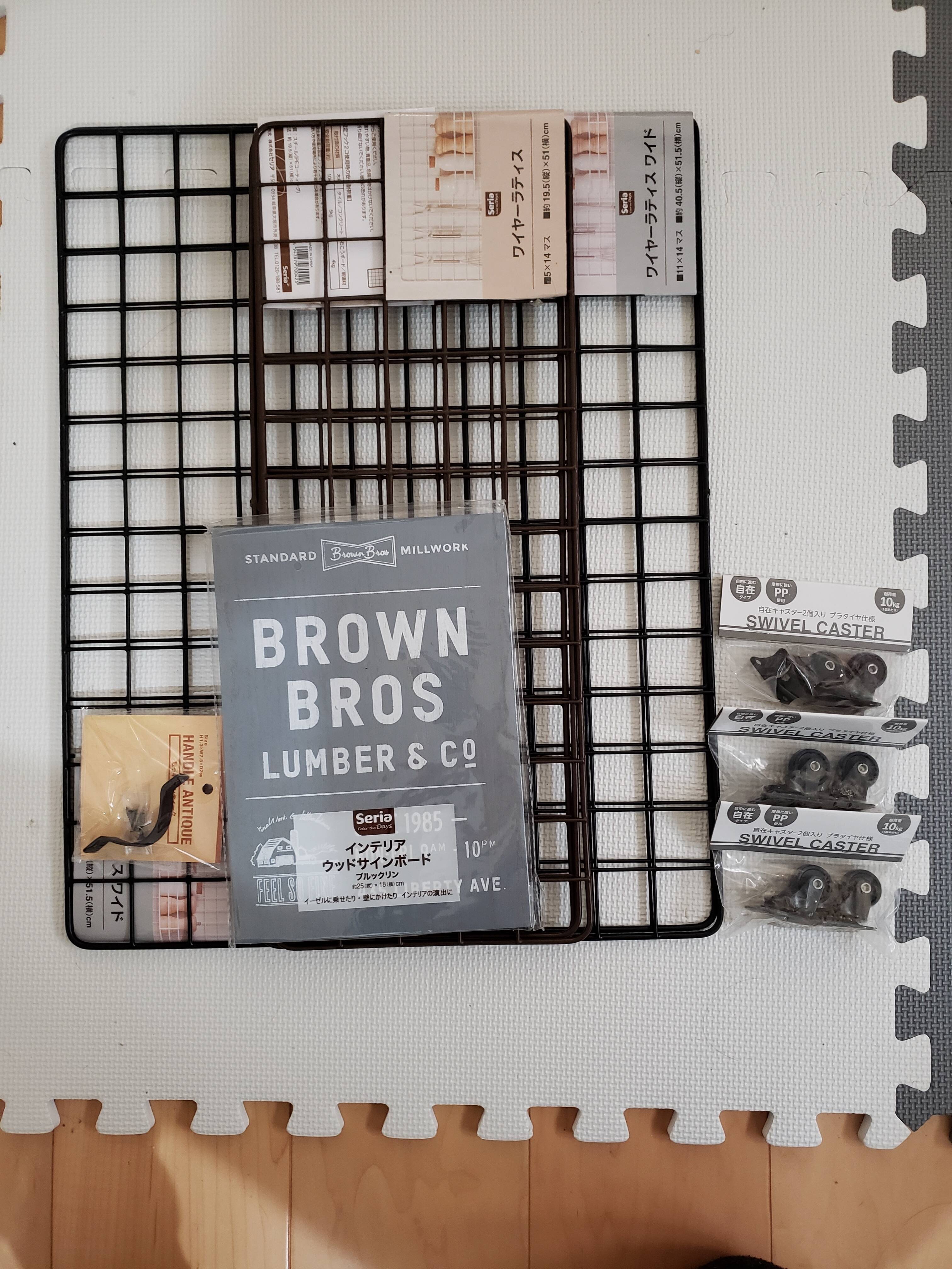 結束バンド 長さ100mm 100本入り 1袋【Seria(セリア) 売場:家電】ワイヤーラティスワイド40、5×51、5cm 11×14マス 2枚【Seria(セリア) 売場:】ワイヤーラティス 19、5×5cm 5×14マス 3枚【Seria(セリア) 売場:】キャスター2個入り 2袋【Seria(セリア) 売場:DIY材(スノコ、工具、フック等)】ウッドプレート 1枚(お好きな柄で)【Seria(セリア) 売場:装飾品】取っ手 アンティーク 1個【Seria(セリア) 売場:DIY材(スノコ、工具、フック等)】■必要な道具