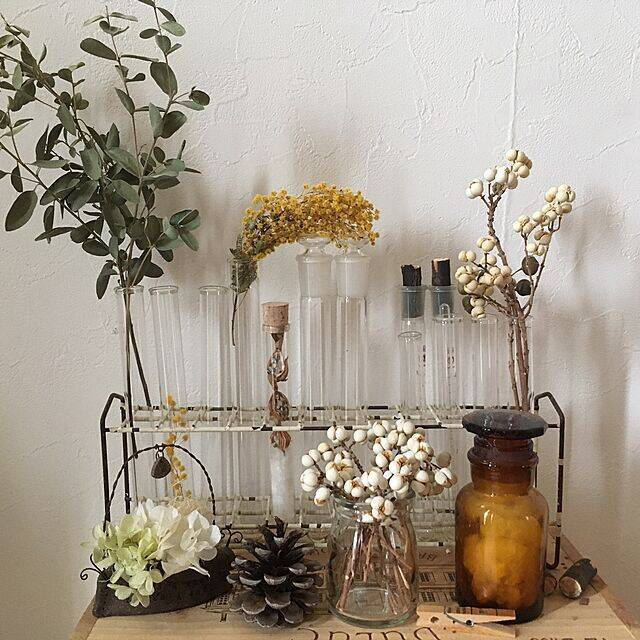 理系とボタニカルインテリアをミックスさせた、絶妙なバランスがアートのように映りますね。試験管をフラワーベースとして使い、こなれた空間を作っていました。個性的な植物を合わせることで、華やかさも加わります。かたくるしくなりすぎないナチュラルさが魅力です。