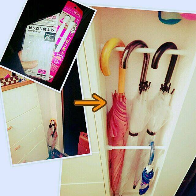 sshioさんは、玄関のドア裏を利用して傘を収納しています。100均のマグネットタイプの傘立てをくっつけて、そこに二本の傘を入れられるようにしてあります。出かけるときに、うっかり傘を忘れてしまうのも防いでくれそうですね。