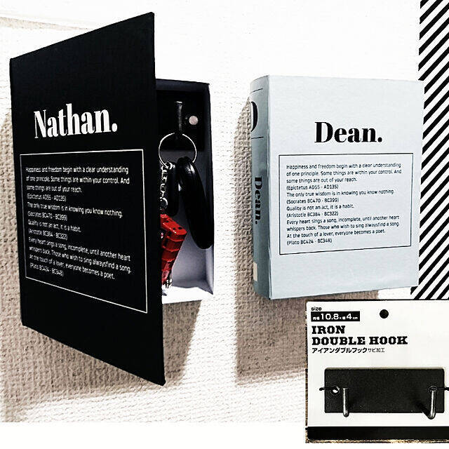 c-boさんは、セリアのブック型ペーパーボックスで鍵収納を作っています。同じセリアの「アイアンダブルフック」を内側にはめ込んで、フックの穴に画ビョウで固定してあります。ボックスはマグネット付きなので、簡単に開閉することができるそうですよ。