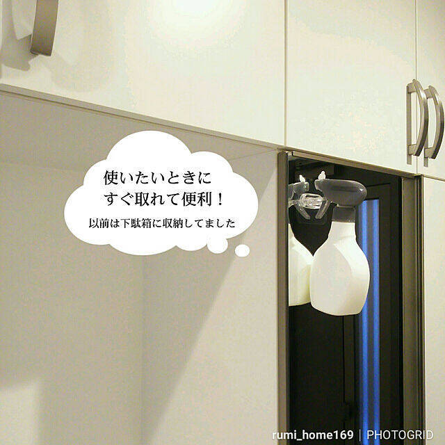 rumi_home169さんは、セリアの「フィルムリングフック」でファブリーズを収納しています。靴箱のミラー部分にフックを貼り付け、スプレーボトルを掛けられる収納スポットにしました。使いたいときすぐ手に取れて、便利になったそうです。