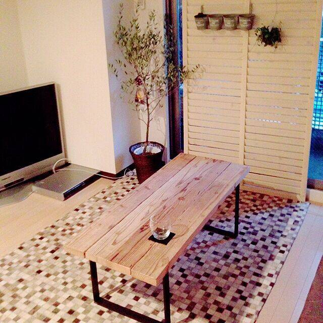 ホームセンターでお手ごろ価格な木材を集め、パレットテーブルにしたというユーザーさんがこちらです。下に敷いてあるグリーンのラグと相性抜群のナチュラルアイテムですね!板のきれいな木目にも目を惹かれます。