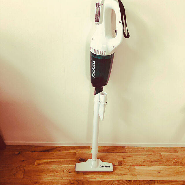 poncoさんは、マキタの掃除機にサイクロンアタッチメントをつけました。本体の白×アタッチメントの水色がさわやかな組み合わせですね。マキタの掃除機はスリムなデザインなので、出しっぱなしにしても存在感を感じさせません。