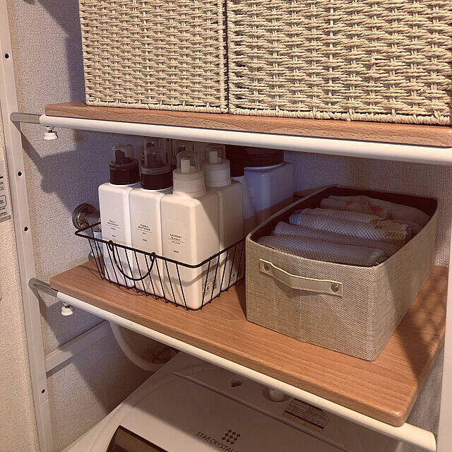 puiさんは、洗濯洗剤を入れて使っています。バスケットのシンプルなデザインに合わせて、洗剤の容器も白で統一されていて、清潔感のあるスッキリとしたランドリーになっています。もし洗剤がこぼれてもさっと拭き取れたり、容器のラベルがすぐ見えるので手に取りやすく使いやすいですね。