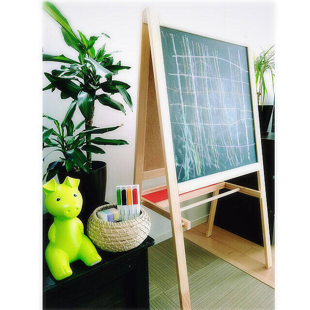 IKEAで販売されているお絵かきボードの横に置かれているのは、同じくIKEAのシーグラスでできたフタ付きボックスです。こちらでは、フタを取った状態でお絵かきに使うペンやチョークを入れられています。並んで置かれたグリーンや、ブタさんともなじんでいますね。